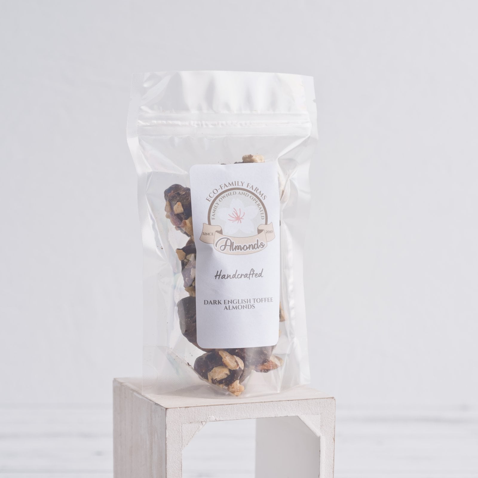 Buttery toffee dipped in dark chocolate and rolled in diced almonds.